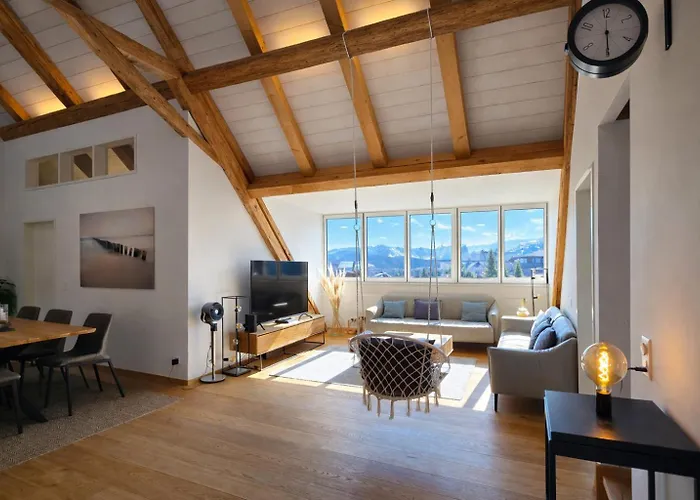 The apartment offers self-catering amenities, such as an equipped kitchen, and an outdoor dining area for guests' convenience. Belp airport is at a 30-minute driving distance, and Des Alpes bus stop is a stone's throw from Niesen Loft Apartment.